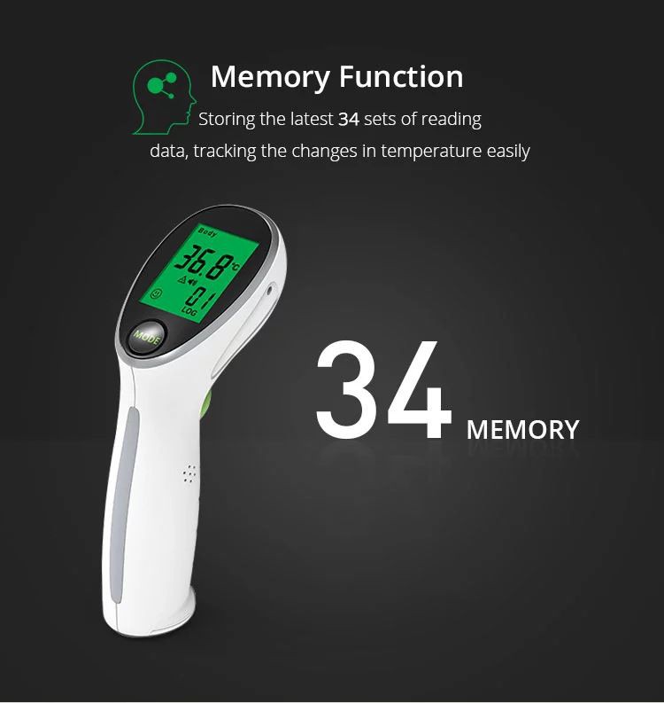1) aniq va tez: o'lchash xatosi 0,2 ga va o'lchash tezligi 1 soniyaga yetishi mumkin; 2) Keng harorat o'lchovi: o'lchash oralig'i 0.0-100 ga yetishi mumkin; 3) ko'p marta ishlatish: tana haroratini o'lchash: tana harorati; Ob'ekt haroratini o'lchash: masalan, guruch pastasi harorati; Suyuq haroratni o'lchash: masalan, vannadagi suv harorati va sutning harorati. 4) Xavfsizlik va sog'liq: Peshonadagi haroratni kontaktsiz o'lchash. U inson terisiga tegmasdan 3-5 sm masofada o'lchanadigan masofani bosib, xoch infektsiyasini oldini oladi. 5) Oddiy va foydali: bitta tugmachali o'lchov, bitta tugmachali kommutatsiya rejimi va oddiy ishlash. 6) Akusto-optik signal: Yashil, sariq va qizil yoritgichlar tana harorati normal yoki past ekanligini, isitmani pasayishini yoki yuqori isitma borligini va “Beep” ovozli signalini bildiradi. 7) Bir nechta xotira to'plami: oson tahlil qilish va taqqoslash uchun 34 o'lchov ma'lumotlarini saqlashi mumkin. 8) Lazer joylashishini aniqlash nuri: o'lchov holatiga ishonch hosil qilish foydalanuvchi uchun qulaydir. 9) Tuzatishni sozlash: Terining ranglari va turli xil xususiyatlarga ega inson tanalariga ega etnik to'plamlarga moslashishi uchun uning sozlash parametrlari qayta ko'rib chiqilishi mumkin.
