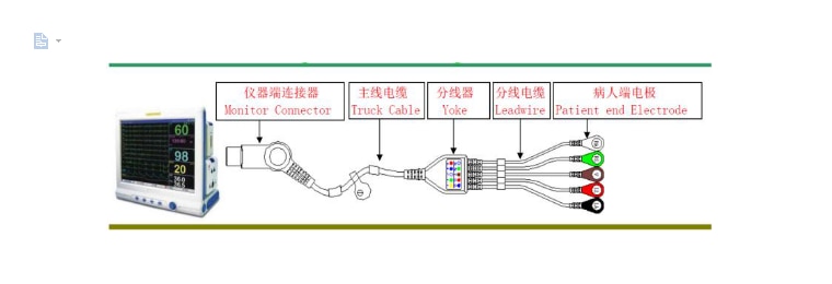 Ko'p parametrli monitor / elektrokardiyogram mashinasi uchun murojaat qiling / yugurish yoki defibrilator, inson tanasining bio-elektr signalini uzating. Bemorning simlari va elektrodli simlar bemorning tegishli joylarida joylashgan elektrodlar, kateterlar va / yoki sensorlarni sog'liqni saqlash mutaxassisi tomonidan umumiy monitoring va / yoki diagnostik baholash uchun monitoring moslamasiga ulash uchun ishlatiladi.
