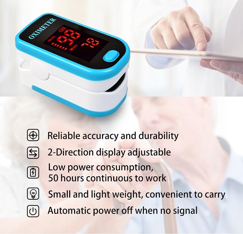 Barmoq pulsining oksimetri - bu yurak urish tezligini va qon kislorod bilan to'yinganligini tekshirishning qulay va aniq usuli. Shuningdek, u aniqlikni kafolatlaydigan Pletismograf to'lqinini ham ko'rsatadi. O'z-o'zidan sozlanadigan barmoq qisqichi va oddiy bitta tugmachali dizayni oson ishlashga imkon beradi. Yuk ko'taradigan sumka va bo'yin / bilak shnuri bilan birga keladi. Hamshira va shifokorga bo'yniga osib qo'yish qulay. Kichik ko'chma o'lcham ishlov berishni va olib yurishni osonlashtiradi. Kundalik foydalanish uchun javob beradi, har qanday vaqtda sog'lig'ingizni o'lchang.