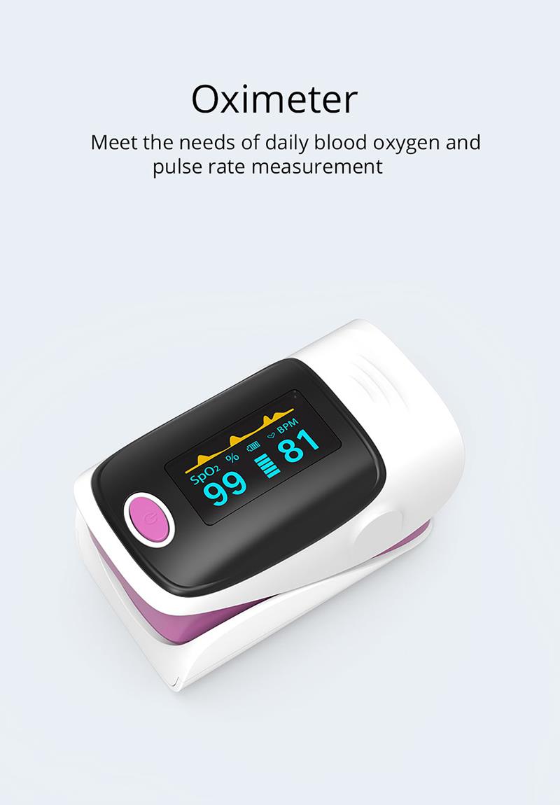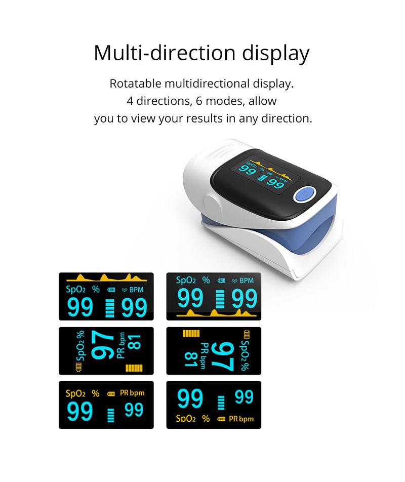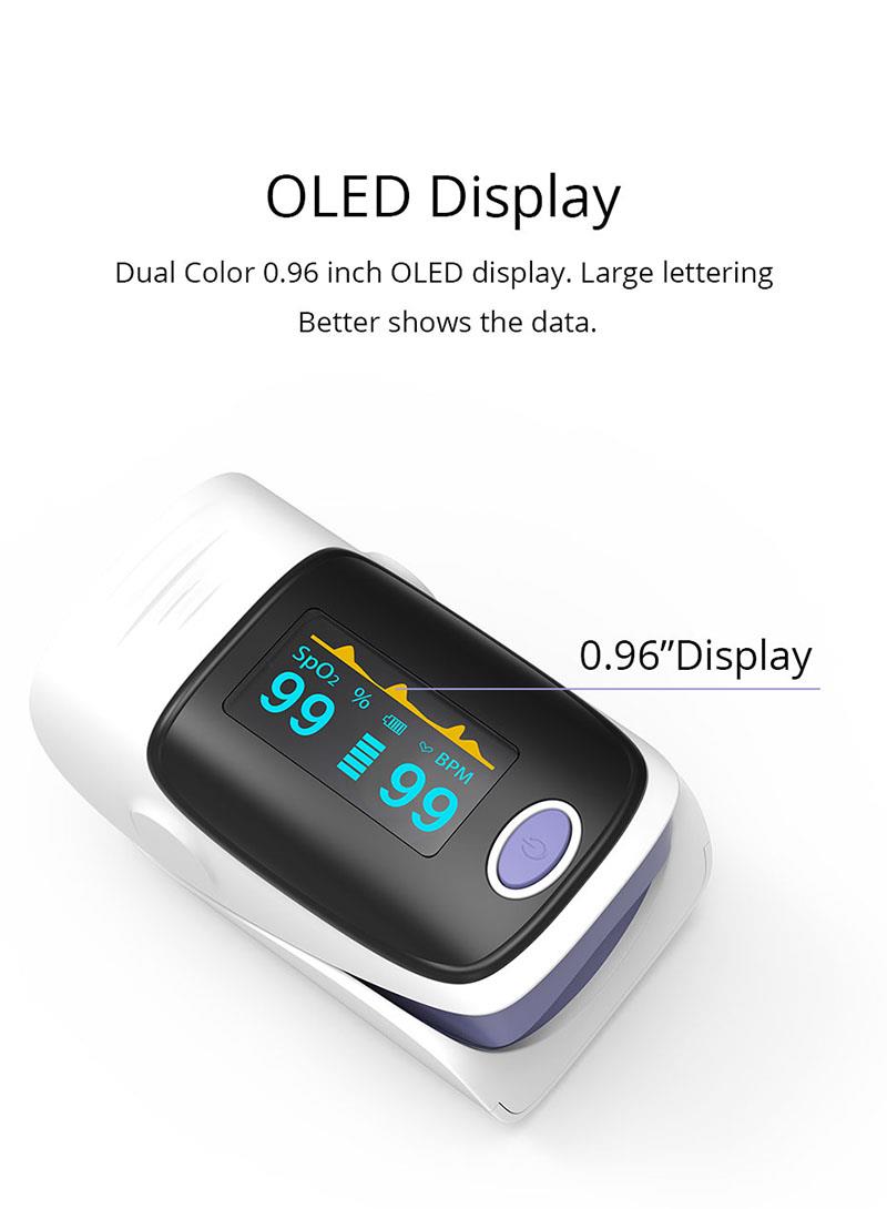 Barmoq pulsining oksimetri - bu yurak urish tezligini va qon kislorod bilan to'yinganligini tekshirishning qulay va aniq usuli. Shuningdek, u aniqlikni kafolatlaydigan Pletismograf to'lqinini ham ko'rsatadi. O'z-o'zidan sozlanadigan barmoq qisqichi va oddiy bitta tugmachali dizayni oson ishlashga imkon beradi. Yuk ko'taradigan sumka va bo'yin / bilak shnuri bilan birga keladi. Hamshira va shifokorga bo'yniga osib qo'yish qulay. Kichik ko'chma o'lcham ishlov berishni va olib yurishni osonlashtiradi. Kundalik foydalanish uchun javob beradi, har qanday vaqtda sog'lig'ingizni o'lchang.